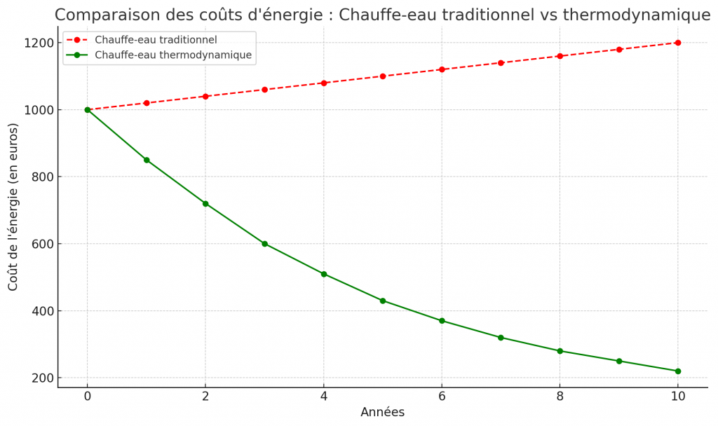 Chauffe-eau thermodynamique : Grâce à l’exploitation des calories de l’air ambiant, ce système permet de réduire considérablement les besoins en énergie. Dès la deuxième année, on observe une baisse importante des coûts, et cette tendance se poursuit au fil du temps. En dix ans, les économies réalisées sont conséquentes, rendant l’investissement initial plus que rentable.